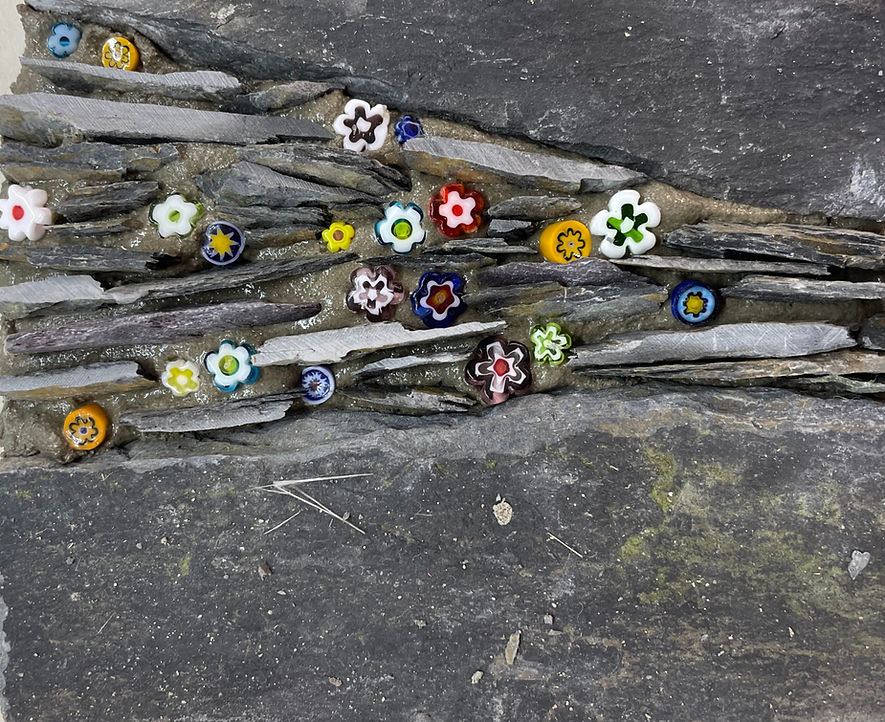 Fitting with the theme of Reusing, Recycling and using Local, Slate which although not quarried locally is widely available in the valley in the form of roof slates, used for centuries on the valley homes and factories, this forms the basis of our mosaic workshops.